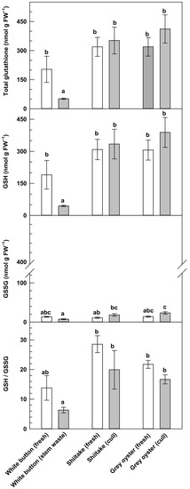 Mushrooms contain dietary fiber, minerals, and vitamins (e.g., niacin) including the vitamin D2 precursor ergosterol [1,2]. Moreover, fresh mushrooms supply the human diet with the antioxidants glutathione and ergothioneine [3]. In nature, glutathione occurs in reduced (i.e., GSH) and oxidized (i.e., glutathione disulfide, GSSG) forms. In most organisms, reactive oxygen species (ROS) such as hydrogen peroxide are detoxified to less reactive molecules (e.g., water), a step that is metabolically coupled to the conversion of GSH to GSSG by peroxidases within the glutathione–ascorbate recycling pathway [4]. During postharvest storage and handling practices, this pathway limits oxidative stress-related events that promote the cellular damage associated with physiological disorders of fruit (e.g., apples, tomatoes) and the yellowing of green vegetables [5,6]. GSH is present in many organisms including fresh plant and meat products. GSH concentrations in foodstuffs range from 16 to 855 nmol g fresh weight (FW)−1, with some of the highest levels measured in pork, spinach, broccoli, green bell pepper, avocado, and asparagus [7,8]. Similarly, a wide range of total glutathione (i.e., sum of GSH and GSSG) concentrations are evident in fresh culinary mushrooms, with as much as 1.1 µmol g FW−1 in maitake, and as little as 111 nmol g FW−1 in crimini mushrooms [3]. It is important to note that this study did not assess the proportion of GSH and GSSG in the mushrooms investigated therein. Thus, the finite amounts of GSH and GSSG remain unknown in the culinary mushrooms that are grown in North America.