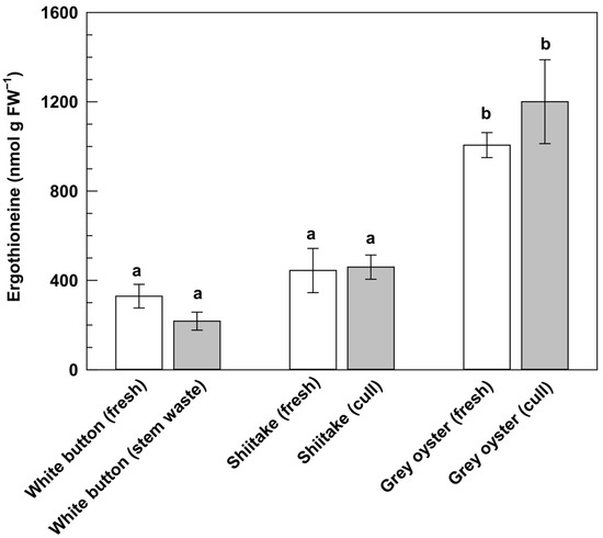 Ergothioneine concentrations in fresh mushrooms and waste generated from the cultivation of white button, shiitake, and grey oyster mushrooms. All ergothioneine concentrations were calculated on a per g fresh weight (FW) basis. Within each plot, each datum represents the mean ± standard error of three cultivation replicates, and no statistical difference is represented by means sharing the same letter (α ≤ 0.05).