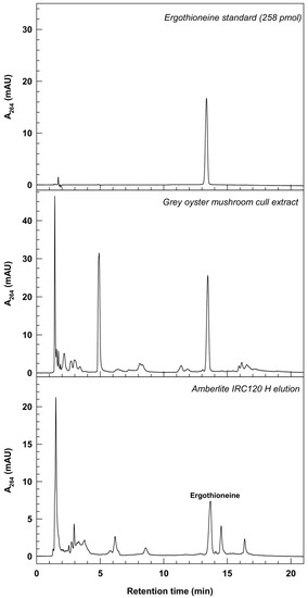 The second aim of our study was to develop a feasible strategy for the capture of ergothioneine from mushroom biomass waste. We used oyster mushroom culls for small-scale ergothioneine purification, as this waste material had the most ergothioneine. Borodina et al. [41] proposed that ion exchange chromatography could be used to isolate ergothioneine from mushrooms, although this has never been tested. Here, Amberlite IRC120 H (hydrogen form) (i.e., cation exchange) column chromatography was used to capture ergothioneine from ethanolic extracts of oyster mushroom culls (Figure 4). The procedure was adapted from a strategy used for the separation of amino acids derived from corn kernels [26]. A survey of the spectral properties of the peaks in the HPLC chromatogram of the oyster mushroom cull extract revealed that many of these metabolites had absorption maxima within the UV light range that are typical of most amino acids [42]. Ethanolic extracts of mushrooms are known to contain amino acids [43].