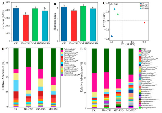 The richness and Shannon index of bacterial α-diversity in the MO-RSD- and DA-CSF-treated soils considerably decreased (p < 0.05), whereas the Shannon index in the GC-RSD-treated soil considerably increased compared with that in the CK soil (Figure 1A,B). Notably, the lowest bacterial α-diversity was detected in DA-CSF-treated soil. In addition, bacterial β-diversity among the different treatments was obviously different (p < 0.01), whereas a similarity in bacterial β-diversity was found between the GC-RSD- and MO-RSD-treated soils compared with that in the DA-CSF-treated soil (Figure 1C).