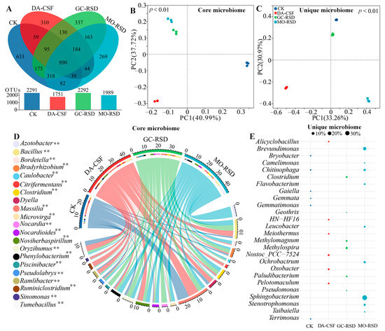 Impact of DA-CSF and RSD treatments on the soil bacterial core and unique microbiome. (A) The number of core, unique, and overlapped OTUs in the different soil samples. (B,C) Principal coordinate analysis of the bacterial core and unique microbiomes, respectively. (D,E) Relative abundances of the dominant core and unique microbes at the genus level, respectively. “**” in the (D) plot indicates that the given core genus between different treatments showed significant differences at p < 0.01, according to the LSD test. Definitions for the treatment abbreviations are listed in Table 2.