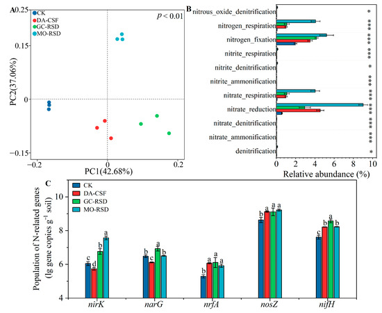 Impact of DA-CSF and RSD treatments on soil functions. (A) Principal coordinate analysis of the overall bacterial functions that were predicted using FAPROTAX. (B,C) The relative abundances of the nitrogen-related functions and the expression of the dominant nitrogen-related genes between different treatments, respectively. Error bars represent SDs. “*” or “***” in plot (B) and different lowercase letters in plot (C) indicate that the given nitrogen-related function and gene between the different treatments exhibited significant differences at p < 0.05 or p < 0.001, according to the LSD test, respectively. The nirK and nrfA, narG, nosZ, and nifH genes represent nitrite reduction, nitrate reduction, nitrous oxide reduction, and nitrogen fixation genes, respectively. Definitions of the treatment abbreviations are listed in Table 2.