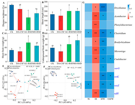 Plant biomass properties and potential bio-indicators. (A–D) Disease incidence (DI), shoot length (SL), shoot fresh weight (SFW), and underground fresh weight (UGFW). Error bars represent SDs and the different lowercase letters among different treatments indicate significant differences at p < 0.05, according to the LSD test. (E,F) Procrustes analyses of PCoA ordination plots between the core microbiome and plant biomass properties and nitrogen-related genes, respectively. (G) Relationships between the abundances of the core microbes and nitrogen-related genes and plant biomass properties. Only the core microbes that were significantly and negatively correlated with disease incidence and the nitrogen-related genes that were significantly and positively correlated with shoot fresh weight are listed. “*”, “**”, and “***” represent p < 0.05, p < 0.01, and p < 0.001, respectively. Definitions of the treatment abbreviations are listed in Table 2.