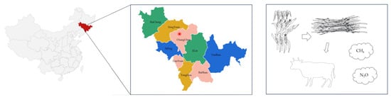 Global greenhouse gas emissions have led to climate change and other issues. Countries and regions have adopted corresponding emission reduction plans and formulated main emission reduction goals to reduce greenhouse gas emissions and avoid extreme disasters [1,2,3]. Currently, carbon peaking and carbon neutrality have become hot research topics among scholars worldwide [4,5]. Agriculture is the second largest source of greenhouse gas emissions [6], with livestock being the main source of agricultural greenhouse gas emissions, mainly of CH4 and N2O [7]. After China’s rapid social and economic development following its reform and opening up, the demand for livestock and its by-products has rapidly increased, making it the world’s largest meat consumption market [8]. The greenhouse gas emissions generated from the fermentation of livestock intestines and feces management processes account for 42.8% of China’s total agricultural emissions [9], with ruminant animals being the main source of emissions [10,11]. Agricultural low-carbon emission reduction has become an important part of China’s ecological civilization construction [12,13,14]. In 2021, the Jilin Provincial Government issued the “Opinions of the Jilin Provincial People’s Government Office on the Implementation of the ‘Straw to Beef’ project and the Construction of a 10 million Head Beef Cattle Project”, which requires Jilin Province to reach 10 million head of beef cattle and utilize 24 million tons of straw as feed by 2025. As of the end of 2021, the number of beef cattle in Jilin Province was 3.383 million, and the annual production of straw exceeded 40 million tons. Effective prediction of greenhouse gas emissions from beef cattle in 2025 and beyond is significant for achieving the carbon peak and carbon neutrality in Jilin Province’s agriculture [15]. The map of Jilin Province in China and the explanation of the ‘Straw to Beef’ project are shown in Figure 1.