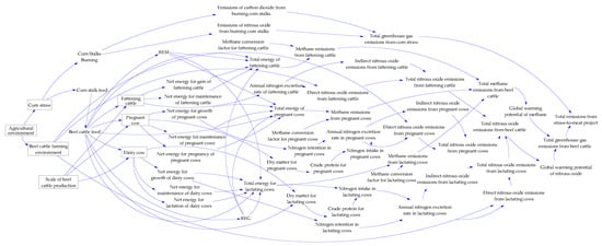 The system dynamics method was created by Forrester in the 1960s and is mainly used to simulate the interactions between internal feedback and cyclic effects within a system over a certain time. Starting from the influence of emission factors, this method forms a dynamic visualization and complex systems, which can be applied to agricultural research [26]. In this article, combined with relevant studies on beef cattle and corn stover emission simulation [27,28], a greenhouse gas emission estimation model for beef cattle was constructed in Vensim software. The model runs from 2014 to 2028 with a simulation step length of 1 year. Figure 2 depicts a greenhouse gas emission model for beef cattle and straw incineration. This model includes seven hierarchical variables: agricultural environment, beef cattle farming environment, scale of beef cattle production, corn straw, fattening cattle, pregnant cow, and dairy cow. These variables are influenced by 51 auxiliary variables such as “Corn stalk feed” and “Beef cattle feed”. The connecting lines represent the relationships and interactions between different emission variables, and the direction of the lines indicates the causal relationships between emission variables.