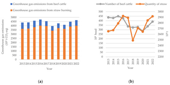 Greenhouse gas emissions from cattle breeding and straw burning from 2013 to 2022.