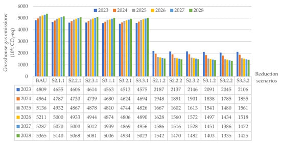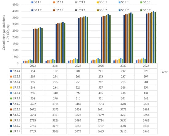 The simulated emission amounts and proportions under different scenarios from 2023 to 2028 are shown in Figure 4 and Figure 5. The figures indicate that the emissions for the single emission reduction scenario show an upward trend, with greenhouse gas emissions for scenarios S2.1.1, S2.2.1, S2.3.1, S3.1.1, S3.2.1, and S3.3.1 increasing from 46.55 million tons, 46.06 million tons, 46.14 million tons, 45.63 million tons, 45.13 million tons, and 45.75 million tons, respectively, to 51.40 million tons, 50.68 million tons, 50.81 million tons, 50.06 million tons, 49.34 million tons, and 50.23 million tons, with annual growth rates of 2.08%, 2%, 2.02%, 1.94%, 1.87%, and 1.96%, respectively. However, the comprehensive emission reduction scenarios all show a downward trend. The annual reduction rates for scenarios S2.1.2, S2.2.2, S2.3.2, S3.1.2, S3.2.2, and S3.3.2 in the integrated reduction scenarios are 5.9%, 6.24%, 6.18%, 6.58%, 6.94%, and 6.47%, respectively. Although the emission amounts for the single emission reduction scenario still account for over 90% of the baseline scenario amount, the emission amounts for the comprehensive emission reduction scenario only account for less than 35% of the baseline scenario amount. This indicates that the capacity for the comprehensive emission reduction scenario is greater than that for the single emission reduction scenario. While single-reduction technologies can reduce greenhouse gas emissions to some extent, the effect is not significant. In comparison, comprehensive reduction technologies have better results in reducing emissions.
