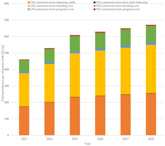 Prediction of beef cattle emissions at different growth stages under S3.2.2 scenario from 2023 to 2028.