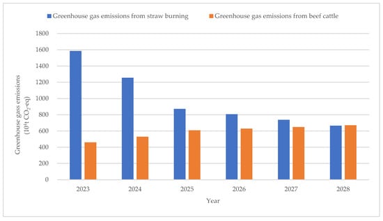 Taking the ‘Straw to Beef’ project in Jilin Province as an example, the article utilized a system dynamics approach to simulate greenhouse gas emissions, combined with the calculation standard of IPCC and existing agricultural production data. We estimated the emissions under the baseline scenario and the 12 simulated scenarios; an analysis of greenhouse gas emissions from the 12 simulated scenarios was conducted to identify the optimal simulation scenario. Effective methods to reduce emissions were proposed based on the most optimal simulation scenario. Firstly, greenhouse gas emissions from straw burning and cattle breeding have an increasing trend from 2013 to 2022. In 2020, in Jilin Province, the total emissions reached 41.2 million tons (measured in CO2-eq), which subsequently increased to 46.72 million tons in 2022, representing an annual growth rate of 6.7%. The growth rate during this period was significantly higher than that observed between 2013 and 2016. Furthermore, from 2023 to 2028, scenarios S2.1.1 and S3.1.1 achieved cumulative emission reductions of 11.88 million tons and 19 million tons, respectively, corresponding to reductions of 3.86% and 6.17% compared to the baseline scenario. Emission reductions of 11.88 million tons, 15.68 million tons, and 15.04 million tons, equivalent to reductions of 3.86%, 5.10%, and 4.89%, respectively, compared to the BAU scenario, were observed for scenarios S2.1.1, S2.2.1, and S2.3.1. Scenario S3.2.2 demonstrated the highest emission reduction capacity, achieving a cumulative reduction of 213.07 million tons, highlighting the substantial contribution of greenhouse gas emissions from straw burning. Thirdly, targeted emission reduction measures should be implemented to address the agricultural situation in Jilin Province. Implementation of these methods will effectively reduce greenhouse gas emissions by integrating corn planting [37] and cattle breeding [38]. These methods will effectively reduce greenhouse gas emissions from beef cattle and straw burning [39]. Moving forward, Jilin Province should carry an ecological recycling agricultural production and significantly enhance the production capacity of the beef cattle industry through environmentally friendly and efficient practices.