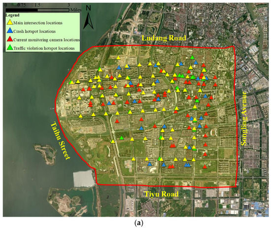 Study area and traffic monitoring locations. (a) Monitoring camera and event locations. (b) Potential traffic monitoring locations.