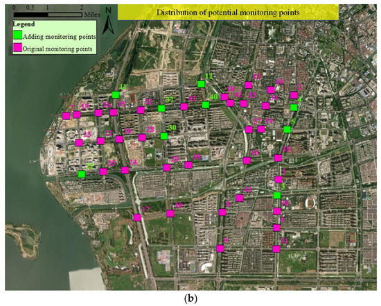 The Wujiang District of Suzhou, China, was selected as the study area. The specific ranges of the selected area are the rectangular region enclosed by Ludang Road, Tiyu Road, Songling Avenue, and Taihu Street. We collected one year’s historical crash data, traffic violation data, and traffic volume data from the study area. Then, the traffic violation hotspots and crash hotspots could be identified using these historical data. The locations of the current traffic monitoring cameras, traffic violation hotspots [29], crash hotspots [29,30], and the main intersections of the study area were determined and mapped onto the road network (see Figure 2a). Then, the potential deployment points used to optimize the road monitoring camera settings were determined according to the setting principle of the road monitoring camera. These potential points consist of two parts: the original monitoring points, and the additional monitoring points. The original traffic monitoring points are primarily the current traffic monitoring camera locations, and the additional monitoring points contain the key intersections that feature a high traffic volume, frequent traffic violations, and frequent crashes. A total of 43 potential traffic monitoring points were determined in this study (see Figure 2b, wherein the numbers denote the deployment location ID).
