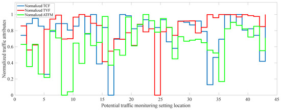 The values of ATFM, TCF, TVF present dimensional differences, making it difficult to analyze their impacts on the deployment location of traffic monitoring cameras. Accordingly, we normalized them into the range of [0, 1], as shown in Figure 4.