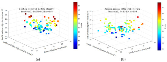 To compare the performance of different algorithms, we used our proposed method, RVEA, and another multi-objective optimization algorithm, NSGA-II, to solve the multi-objective optimization model, respectively. In the process of solving the NSGA-II method, the number of optimization objectives is M = 3 (minimizing the ATFM, TCF, and TVF), the initial population is N = 100, and the maximum number of iterations is maxFE = 1000. The 0–1 integer programming method is used to determine whether the potential deployment point should be chosen as the monitoring setting location. Since there are 43 potential deployment points, there are 43 problem variables. With regard to the RVEA method, the initial population, the optimization objective, and the maximum number of iterations are the same as those of the NSGA-II method. Then, the self-defined parameter is ɑ = 2, fr = 0.1. The spatial iterations of the three objective functions (e.g., , , ) using NSGA-II and RVEA are shown in Figure 5a,b, respectively.