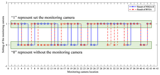 In the model results (see Figure 6), “1” represents that the current point is selected as the location for traffic monitoring camera setting, “0” denotes that the current point is not the deployment location for traffic monitoring cameras. The results of the optimization of the traffic monitoring cameras’ deployment among the total 43 potential points were then obtained. Figure 7 shows the final deployment scheme of the NSGA-II and RVEA methods. From the results, it can be seen that cameras are deployed at only 27 locations among the 43 potential setting points. This can be attributed to the cost constraint, since it is impossible to set a traffic monitoring camera at every location. Working with a limited budget, we should preferentially deploy the traffic monitoring cameras at the most urgent locations, such as intersections with a high traffic volume, frequent crashes, and traffic violations. This is why the highest deployment rate of traffic monitoring cameras, as shown in Table 2, is 62.79%.