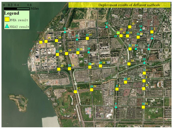 As can be seen from the FAHP evaluation results, the p-value of the RVEA scheme is slightly higher than that of the NSGA-II scheme, indicating that the RVEA scheme is better than the NSGA-II scheme. In addition, we also compare the sub-objective functions (e.g., ) of the optimization setting model, as well as the Z-value of NSGA-II and RVEA. The comparisons illustrate the value of the best optimization scheme solved by the RVEA is higher than that of the NSGA-II, but the , and Z-values of the RVEA are all lower than those of the NSGA-II (see Table 5). Lower objective functions and Z-values indicate a better deployment scheme for traffic monitoring cameras. Overall, the RVEA method outperformed the NSGA-II method in optimizing a scheme for the deployment of traffic monitoring cameras.