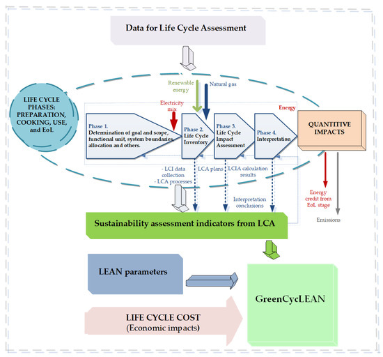 Examining the energy demand and environmental impact of the preparation and cooking processes is essential in optimizing the cooking processes. It is primarily the environmental impact of different energy supply methods and the increasing demand for cooking methods. It is rarely discussed how the optimization cooking process and the life-cycle assessment can jointly help design decision-making for restaurant chains. Different scenarios can be considered during the LCA-based examination of cooking methods by determining energy consumption and ecological burden. To draw broad conclusions, it is advisable to conduct a modeling process in which the possible examined parameters are the primary energy resource, the occurring environmental impact categories, and the ecological loads of the renewable and nonrenewable energy supplies. To implement this research purpose, a sustainability assessment model was developed. The developed model is primarily based on the quantitative method with the help of defining quantitative indicators. Because the sustainability assessment model uses calculation and statistical data for primary energy, emission, carbon footprint, and environmental impact categories, the LCA method is authoritative during the development of the model, where all life-cycle phases of the restaurant products are examined from ecological and energetic viewpoints. The GreenCycLEAN relies on the results of the LCA calculation and the lean. The development objective includes data collection for the LCI and impact assessment methods. The given model has different LCA phases in the restaurant product’s life-cycle stages, as illustrated in Figure 8.