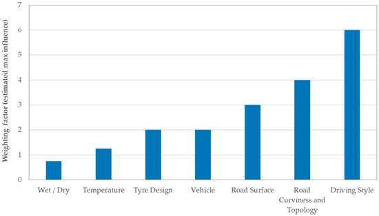 For the identification of potential hotspots, an understanding of the main influencing factors of tire-wear generation is essential. From the experience of an external panel of experts, the abrasion factors for a passenger car tire have been estimated, as shown in Figure 2. The analysis shows that the topology and the driving behavior of motorists are the greatest influencing factors with regards to tire abrasion [30]. Similar results can be found in the TyreWearMapping report. When modelling the physical factors influencing the tire in connection with the German road network, the model calculated about 80% of the tire wear at intersections and curves [31].