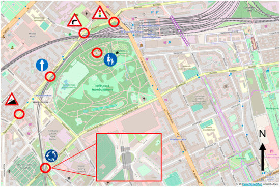 The area in which the sites are located is an urban residential area with various services of general interest and parks. The buildings usually have five floors, and there are tree grates along most of the streets. A distinctive feature of the sampling spots, labelled “straight”, “traffic light”, and “curve”, is the rail line that runs along the eastern side below the street, but the impact of this could not be investigated in this piece of research. The streets where the measurement sites are located have a roof profile, and they thus drain to both sides of the street, which is common for the Berlin metropole region. The samples were taken on one side of the road. The roundabout, as shown in Figure 3, connects four roads, and it has a section where the road is straight rather than curved. The details of the sampling locations are shown in Table 1.