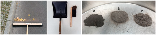Hall broom with horsehair (left) and hand brush with dustpan (center) and examples of the RDS samples ((right): (a) 20–50 µm, (b) 50–100 µm and (c) 100–500 µm).