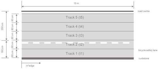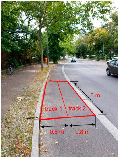 With the findings of the RDS particle distribution investigations across the road, the dimensions of the detailed studies of the hotspots were adjusted. The sampling time interval should be as short as possible or as long as necessary in order to minimize external influences and, at the same time, to represent the traffic pattern. Accordingly, a time interval of 24 h was chosen. The areas sampled for over 24 h have a length of 6.0 m and a width of 1.6 m parallel to the driving direction. The width of the surface is divided into two areas of 0.8 m each—track 1, which is adjacent to the outer road wheel, and track 2, which is adjacent to the outer road in the direction of the center of the road (Figure 6).