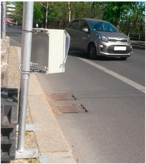 The traffic volume is an important parameter for the investigation and comparability of the volume of solid matter and the amount of TRWP on road surfaces. By selecting the measurement sites, it was considered that the annual average daily traffic (AADT) is comparable. In order to determine the real traffic (average actual daily traffic) within a 24 h sampling campaign, radar measuring device “traffic counters” were used from Wavetec (Figure 7).