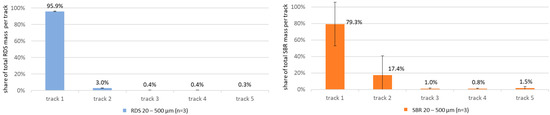 The results of the cross sweeps for the relative mass distribution of all solid particles within the RDS of the fraction sieved 20–500 µm are shown in Figure 8. On average, a total mass of 68.9 g RDS was determined for track 1–5 for the fraction 20–500 µm. To find out whether the TRWPs are distributed analogously to the RDS across the pavement cross-section, the rubber content was measured in the respective fraction. For this purpose, styrene-butadiene rubber (SBR) was chosen as the marker. On average, an SBR quantity of 147.5 mg was detected for tracks 1–5 for the fraction 20–500 µm. This investigation was repeated on different days, and was conducted three times in total (n = 3).