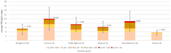 The total masses by fraction from all 24 h samplings (n) per investigation site are shown in Figure 9. The RDS masses per track have been determined as described in the methodology section, and they are specifically shown in meters along the edge (Figure 5). The sampling locations were determined with the ANOVA and Tukey test. No significant differences are found here (Table S3).