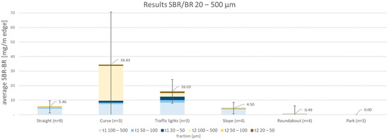 The masses of SBR/m*edge determined in Figure 10 show clear differences within the sampling spots. The SBR results are significantly higher at the curve site in pair-wise comparisons to the sites “straight”, “slope”, and “roundabout” (one-way ANOVA Tukey Test, 95% confidence level (Table S4)). As expected, the mean SBR value of the curve is the highest at 34.43 ± 36.06 mg/m*edge. It is assumed that the higher lateral forces lead to increased emergence. The high standard deviation results from a single value (67.3 mg/m*edge) in the fraction 100–500 µm of track 2. The influence of a single vehicle is suspected, since there are no abnormalities in traffic load, vehicle types, or the sampling protocol. The sampling site of the traffic lights provides the second highest SBR value of 16.03 ± 8.12 mg/m*edge, which is probably also due to acceleration when starting as well as negative acceleration when braking. The “straight” road section 5.46 ± 4.21 mg/m*edge and the “slope” 4.50 ± 3.89 mg/m*edge show lower values but are in the same size range. The values do not correspond to any particular stress, and the driving situation was predominantly fluent. The roundabout 0.49 ± 0.45 mg/m*edge has, contrary to expectations, the lowest SBR results values within the five road sites. In order to be able to carry out the traffic count, the straight section of the roundabout had to be selected (see Section 2.3 above). It is assumed that the road layout at the sampling point and the relatively low speed led to low lateral forces, which affect the measured values. For a detailed description of a roundabout, several measuring points within the roundabout should be considered for future measurements. In the fraction 100–500 µm, most SBR was measured at all traffic locations. As expected, no SBR was found at the park sampling location because no vehicles operate there.