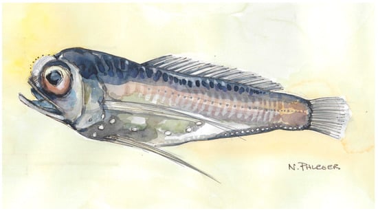 - Nafpaktitis, B.G.; Nafpaktitis, M. Lanternfishes (Family Myctophidae) Collected during Cruises 3 and 6 of the R/V Anton Bruun in the Indian Ocean; Los Angeles County Museum of Natural History: Los Angeles, CA, USA, 1969. [Google Scholar]