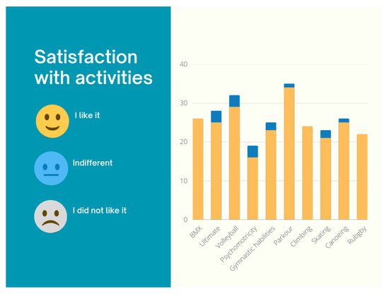 Analyzing the evaluations of the activities considering the gender of the participants, an average of 12.8 boys and 13.2 girls completed the satisfaction survey. The activities best rated by the girls with 100% “I like it” were BMX, psychomotricity, gymnastic abilities, parkour, climbing, and rugby. However, one of the activities most highly rated by the boys was canoeing, coinciding with their satisfaction with rugby, climbing, and BMX.