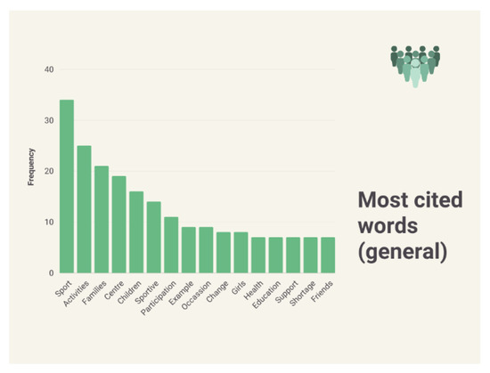 The thematic analysis identified the following “typical responses”, obtaining absolute and relative frequency counts to summarize the results of the questions to these questions. Concerning the results of the bar chart, the following words stand out for their high frequency compared to the rest of the words: sport, activities, families, center, and children. They had significantly higher frequencies than the rest of the words. Figure 4 represents the most frequently cited words.
