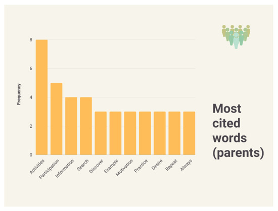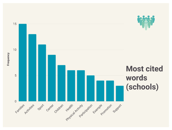 When analyzing the most cited words by category, we found that for parents, the most important concepts are related to action (activities, participation, repetition, practice) and knowledge (information, search, discover), as reflected in the following Figure 5. School leaders identify families, activities, and sport as key elements, with the concepts of health and physical activity appearing, which do not appear in any other category (Figure 6).