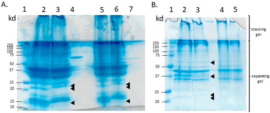 - Brunelle, J.L.; Green, R. Coomassie Blue Staining. In Methods in Enzymology; Elsevier: Amsterdam, The Netherlands, 2014; Volume 541, pp. 161–167. [Google Scholar] [CrossRef]