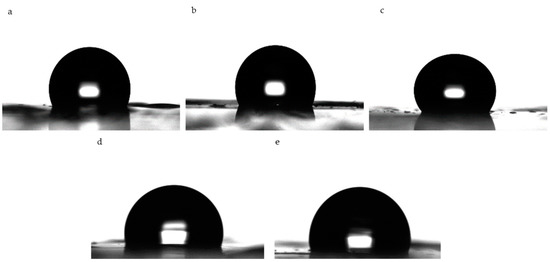 An important parameter for packaging materials is the surface resistance in the water absorption, referred to as wettability. The wettability of a material is measured by the contact angle (CA) between a drop of water and the surface of the film. CA is a meter of the hydrophilic or hydrophobic nature of the polymer [26,31]. Materials with CA values lower than 90° are characterized as hydrophilic materials or materials with CA higher than 90° are referred as hydrophobic materials [25]. The wettability of films provides valuable information about the applicability of nonpermeable or adhesive materials [37]. Table 5 illustrates the CA values for the produced films. Figure 2 represents images of water droplets above the surface of the tested materials. All films had a CA value higher than 90°, indicating the hydrophobic nature of all the produced materials.