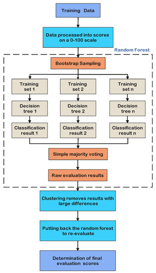 This study aims to adhere to the criteria above by selecting model-driven methods and decision-integration mechanisms. The evaluation algorithm is then constructed based on the big-data-driven paradigm. The following eight evaluation methods have been chosen: analytic hierarchy process (AHP) [25], entropy weight method [26], TOPSIS method [27], weighted rank-sum ratio [28], coefficient of variation method [29], CRITIC weight method [30], cosine value method [31], and gray correlation analysis method [32]. These methods are utilized to construct an effect evaluation model. Furthermore, collective intelligence is integrated using the random forest approach. Based on collective intelligence theory, the data-driven model is illustrated in Figure 3.