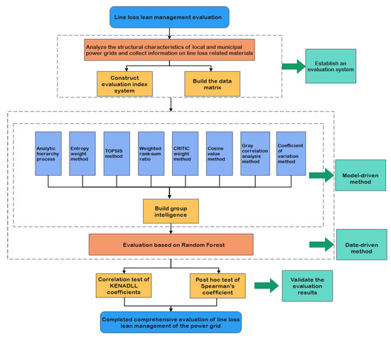 After connecting all the aforementioned processes, the evaluation process of lean line loss management driven by big data is illustrated in Figure 5. Firstly, the evaluation system is established based on a data-driven approach to determine the relevant indicators required for the evaluation system. Through analysis of the characteristics of the relevant power grid structure coupled with the strategic requirements of contemporary power grid enterprise development, the collection of line-loss-related data and information is targeted. The second aspect involves conducting a comprehensive evaluation and analysis. This study adopts a joint evaluation model combining the “model-driven” and “data-driven” approaches for lean evaluation work on grid line loss management. This choice is made based on the four principles of group intelligence theory and considering the current context of the big-data era. For this study, an eight-method group intelligence model is selected to evaluate line loss management using the model-driven approach. Subsequently, the evaluation results are utilized for training in random forest and are compared with the LightGBM algorithm as well as other artificial intelligence algorithms to validate the rationality and effectiveness of the outcomes.
