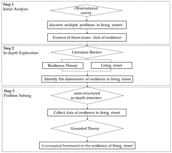In summary, some scholars have extensively explored the application of resilience in the field of urban studies, examining the definition of resilience in urban planning and construction [22], assessment of resilient cities [23], and theory development of the resilient design paradigm of landscape design [24]. However, only a few studies have mentioned the resilience of streets. Safri et al. [25] focused on the elasticity of road networks as part of transportation systems, highlighting the role of a street’s physical form in urban resilience. Living streets are vital spaces for public activities, playing a crucial role in people’s social lives and the smooth functioning of cities. However, they received limited attention regarding their resilience in the existing literature. Consequently, a systematic understanding of resilience in living streets needs to be improved. The resilience of living streets enables cities to recover swiftly from disasters or crises and ensures long-term prosperity and improved well-being of residents.
