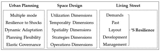 The concept of resilience, initially introduced by Holling, describes the ability of ecosystems to maintain their primary functions, outcomes, and characteristics while undergoing external disturbances and engaging in self-repair [37]. Subsequently, the concept of resilience has been widely applied across various disciplines, each with its own focus. In the urban context, resilience can be summarized as the ability of urban systems to adapt to various negative uncertainties and sudden shocks while effectively capitalizing on positive opportunities [38]. Its application in spatial contexts originates from urban design, which implies leaving room for flexibility, providing multiple modes, and adapting to uncertain external market environments in macro-planning. China’s land development and utilization process has predominantly been characterized by “rigidity” with the additional consideration of “resilience”, even emphasizing flexibility in project processes [39]. In medium-scale spatial design, resilience is often associated with the compatibility of various functions to meet diverse needs and strong adaptability to changes. Specifically, regarding resilience in living streets, we can draw insights from dimensions found in urban planning, architecture, and interior space resilience design (Figure 2).