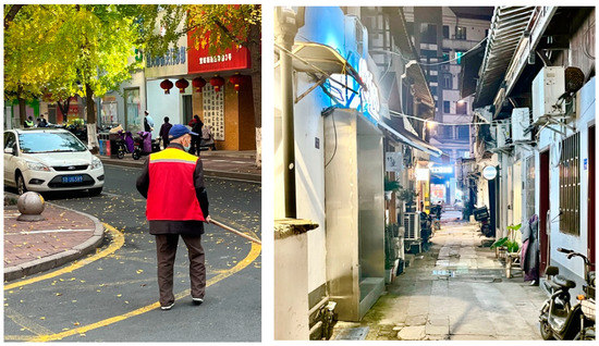 This study explores the resilience of living streets in small and medium-sized towns in the Jiangnan region for two main reasons. Firstly, small and medium-sized towns in the Jiangnan region share certain commonalities, and research conducted in a specific location such as Yixing can not only address local issues but also provide reference models for addressing the resilience challenges of living streets in other small and medium-sized towns in the Jiangnan region. “Jiangnan” represents the local characteristics within this geographical area, encompassing the harmonious coexistence of people and water and a poetic spirit that integrates humanity with nature. Traditional Chinese people think water is associated with “softness” and “dynamism”. This is reflected in the region’s gentle temperament, refined lifestyle, cultural inclusiveness, early and comparatively advanced economic development, and diverse and unified forms of street space. Similar development backgrounds have resulted in similarities in transportation development, traditional transportation organization, and road space construction in small and medium-sized towns within the Jiangnan water network region [42]. However, during the 1960s, rapid urban economic development, accelerated population growth, and rapid land expansion led to the occupation of many ponds and water surfaces for urban construction. The expansion of streets, which were once small and intimate, resulted in the gradual loss of the traditional urban spatial texture and scale, leading not only to the loss of the unique Jiangnan style but also to the lack of humanization, inadequate resilience in the living street spatial environment, and a series of associated problems (Figure 3). In comparison to larger cities, most small and medium-sized towns have fewer independent public service facilities [43]. With the combination of the Jiangnan region’s refinement since ancient times and residents’ pursuit of a relaxed lifestyle, the multifunctionality of living streets in these towns requires further enhancement, and the spatial environment urgently needs upgrading. Lastly, as integral components of China’s urban system, small and medium-sized towns in the Jiangnan region play a crucial role in optimizing the strategic spatial layout of urbanization and forming an organic urban network system [44]. Thus, research conducted in this context has significant implications for driving regional development.