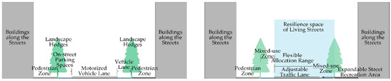 The theory of mutual permeation in environmental behavior studies affirms the inseparable relationship between individuals and their environment [54]. The street spatial environment serves as the material foundation for achieving resilience, encompassing both the initial planning and design stage and the current state of development. Firstly, incorporating foresight during the design or renovation phase enables living streets to possess flexible spaces that can adapt to changes, thus enhancing their resilience. A respondent from the urban planning department stated, “Most street renovations nowadays are due to the inability to meet people’s needs, necessitating updates. If future scenarios are considered in the early design phase, the costs of subsequent renovations can be significantly reduced”. Present-day street transformations should establish sustainable long-term goals, allowing future development and dynamically considering emerging needs. Secondly, by identifying the predominant activities along the street based on the functions of the adjacent buildings, it is possible to tailor the usage patterns of the street space in different periods according to specific needs. For instance, near school zones, designated drop-off and pick-up points for student vehicles can be established using removable bollards to facilitate the conversion between peak and off-peak periods; variable tidal lanes can be implemented to improve traffic efficiency when necessary; and movable urban furniture can be strategically placed, allowing for flexible adjustment of spatial scale. By incorporating flexible adjustment spaces (Figure 8), the utilization of street space can be significantly enhanced.