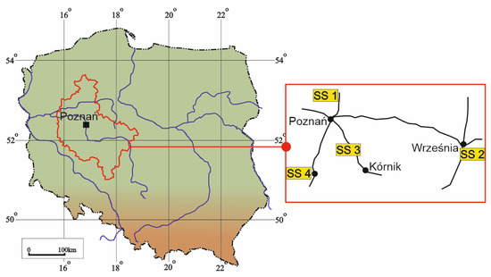 There are 400 different municipal wastewaters treatment plants (WWTPs) operating in the Wielkopolskie province, which treat incoming wastewaters in a similar technological system, generating sewage sludge (SS). In this work, samples of sewage sludge were analyzed, which are exemplary and representative materials of typical WWTPs. Details related to the characteristics of SS treatment, collection, and its preparation for chemical analyses were presented in detail in an earlier papers by Jakubus [22,23]. Here, general information is given to provide understanding of the research context. Sewage sludge samples used in this study were gathered from four WWTPs differing in their designed size expressed as the equivalent number of inhabitants (ENI), and consequently the amount of wastewaters purified and the resulting sewage sludge produced (Table 1). Sewage sludge samples 1 and 2 (SS1, SS2) came from large facilities, serving large urban agglomerations, while sludge samples 3 and 4 (SS3 and SS4) came from small, local installations, serving smaller towns. The locations of WWTPs are presented in Figure 1. The SS samples were collected in three consecutive years after the completed process of SS management at the WWTPs. The SS samples were dried at 105 °C, ground to obtain a homogeneous, uniform structure, and then stored in plastic bags at 4 °C. Briefly, the reporting results concerned SS indicating typical properties characterized by an alkaline reaction, C:N values of 5.8–6.6, Ntot ranging from 50.4 to 73.0 g·kg−1, and the amount of TOC from 329.6 to 420.1 g·kg−1. For the assessment of Ntot and TOC, the Vario Max CNS apparatus was used.