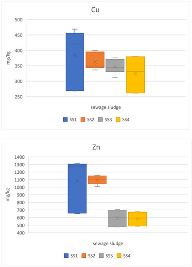 The composition of sewage sludge is the result of many factors [23]; hence, various amounts of heavy metals are presented in the literature. In general, sewage sludge from China is more heavily loaded with heavy metals, which may be related to China’s position in the production of rare earth elements, accounting for almost 50% of world production [21]. In addition, a study conducted by Braga et al. [29] showed higher amounts of these metals in analyzed sewage sludge. The quantitative levels of Cu and Zn in the presented studies are comparable to other data [5,11,30], but they are also higher in relation to the results reported by [2,4,31,32].