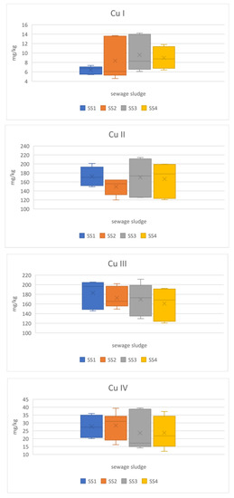 Cu amounts in Fr. IV for SS1 and SS2 were comparable, similarly as for SS3 and SS4. Regardless of the years of the study, the Cu amounts in individual fractions varied within wide ranges, which was particularly noted for SS2 and SS3 for Fr. I, as well as SS3 and SS4 in the case of Fr. II, III, and IV (Figure 3). It should be noted that although SS2 and SS4 came from different facilities (different sizes of wastewater treatment plants, i.e., serving large agglomerations and small municipalities) and significantly differed in the total amount, their average metal contents in the fractions were comparable (Table 4).