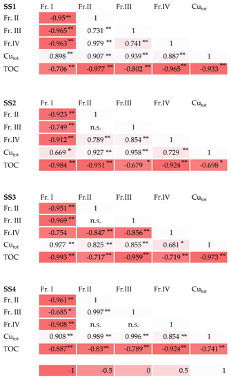 Heat maps for Pearson’s correlation coefficient between Cutot, Cu in fractions and TOC for sewage sludge 1–4. Significance: ** 0.01, * 0.05, n.s.—not significant.
