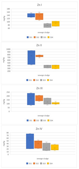 The Zn amounts in separated SS fractions decreased in the following order: Fr. II > Fr. III > Fr. I > Fr. IV, while significantly differing between the analyzed sewage sludge (Table 7). The dominant share of Zn in fractions II and III (i.e., reducible and oxidizable complexes, e.g., bound to iron and manganese hydroxides and bound to organic matter and sulfides, respectively) was indicated by Wang et al. [4], Braga et al. [29], Karwowska and Dąbrowska [31], Zhang et al. [32], Latosińska et al. [34], and Tytła [35]. Those authors also indicated a small amount of the metal in the connections of the residual sewage sludge, with the exception of a study conducted by Latosińska et al. [34], where the lowest level of the metal was showed in fraction I. As presented in Figure 5, the Zn content varied within wide ranges, which was particularly observed for SS1 in fractions II, III, and IV, and SS2, SS3 in fractions III and IV. The Zn amounts in fractions I–III were comparable for SS1 and SS2, not significantly different. In turn, significant differences were noted between the Zn contents both in sewage sludges and their fractions. Regardless of the above, the mean amounts of the metal for SS3 (149.4 mg·kg−1) and SS4 (147.4 mg·kg−1) did not differ significantly (Table 7).