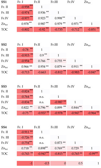 Heat maps for Pearson’s correlation coefficients between Zntot, Zn in fractions, and TOC for sewage sludge 1–4. Significance: ** 0.01, n.s.—not significant.