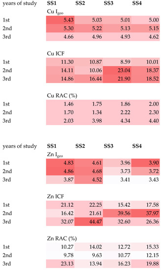 To analyze the possible negative impact of heavy metals contained in sewage sludge on the soil environment, three independent, most popular indicators—the geoaccumulation index (Igeo), individual contamination factor (ICF), and risk assessment code (RAC)—were used in this study. Some parameters, such as Igeo are based on the total amount of metals, while others, such as ICF or RAC use the amount of metals present in various combinations (fractions) with the solid phase of the sewage sludge. The Igeo parameter was used as a method of calculating metal contamination degree in SS. The obtained results (Figure 7) showed that although zinc was present in larger amounts in the SS, the Igeo values were significantly lower than those calculated for Cu. The Igeo values for Cu in the 1st and 2nd year of the study for the SS ranged from 5.0 to 5.43, i.e., they indicated a very high contamination of SS with Cu. In the last year of the study, the SS samples were highly and very highly contaminated with Cu (Igeo: 4.62–4.96) (Figure 7). Regardless of the years of the study, SS1 (except for the 3rd of the study) and SS2 were highly and very highly contaminated with Zn (Igeo: 4.52–4.86). On the other hand, SS3 and SS4 were characterized by Igeo from 3.41 to 3.96, i.e., they were highly contaminated with Zn. The presented differences in the values of Cu and Zn Igeo are a consequence of changes in the total amounts of metal in the years of the study, as well as differences between individual SS samples. Latosinska et al. [34] also stated that Igeo values for analyzed SS indicated a potential high risk of Zn and Cu contamination. In turn, the Igeo values found for Cu and Zn by Nkinahamira et al. [21] or by Zhai et al. [38] were small and indicated no negative impact of heavy metals contained in sewage sludge. Yakamercan and Aygün [2] found domestic SS to be moderately contaminated by Zn and Cu, although the values for Zn were significantly higher than those for Cu. In addition, You et al. [11] assessed the contamination degree of heavy metals based on Igeo. According to these authors, Zn was a metal for which one of the highest pollution indicators was determined, i.e., the pollution level ranged from moderate to strong, whereas Cu pollution was at a medium level.