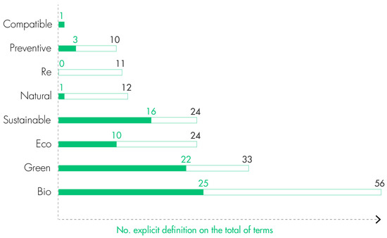 As can be seen from the diagram above, there is ample usage of terms within the conference proceedings, but these percentages drastically change if we consider the percentage of explicit definitions. In fact, if we further investigate the eight lemmas (in the form of prefixes or adjectives), we can detect evident variations (Figure 4). The use of the terms without any reference or description indeed affects all the constructs: it is no coincidence that the lemma of “Bio” includes a lot of constructs without clear definitions (56 uses in total, of which only 25 have been unfolded and explained in the body of the publication); on the other hand, those authors that rely on the use of “Sustainable”—24 papers in total, of which 16 with definition—and “Green”—33 papers in total, of which 22 with definition—seems to be more transparent in clarifying their intention. Looking into detail, in the specific case of bio-oriented terms (Figure 5), 21 different terms are in use, but some of them lack definition (i.e., bio-origin, biology-based, bio-mortar).