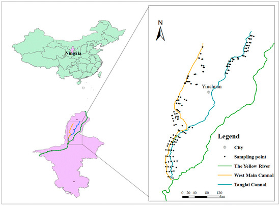 As shown in Figure 1, about 49 points were set in the flow direction of the West Main Canal and the Tanglai Canal, and 1–5 points were set in the transverse direction, depending on to the topography condition. From the head reach of the Tanglai Canal to the Minning Town in Yongning City, the West Main Canal is very close to the Tanglai Canal (the distance between the two canals is less than 3 km), 3–5 points were set at each line transverse to the banks of the canals. However, from Minning Town to the ends of these canals, the distance between them is greater than 5 km, so the sample points were set along the canals independently. Some part of the Tanglai Canal is located in the urban area of Yinchuan City, and the land along the canal is covered with concrete, where no sample points were set.