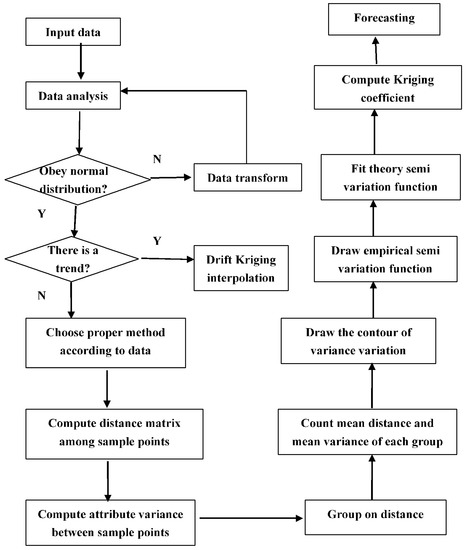 As one of the main contents of geostatistics, Kriging interpolation can unbiasedly and optimally estimate regional variables in finite regions based on variant function theory and structure analysis [26]. Due to the statistical features of geostatistics, Kriging interpolation method can not only obtain predicted results, but also can predict computational error, which is beneficial to evaluate the uncertainty of prediction results. The procedure of Kriging interpolation is shown in Figure 2.